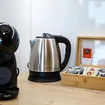 Et værelse har en balkon, kaffe- og tefaciliteter, et skrivebord, mens køkkenet også indeholder kaffemaskiner/tekedler og et køleskab.